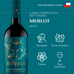 O Diablo Velvet Merlot é um vinho tinto chileno da vinícola Concha y Toro, conhecido por sua textura aveludada, taninos suaves e aromas intensos de frutas vermelhas, com toques sutis de baunilha e chocolate.